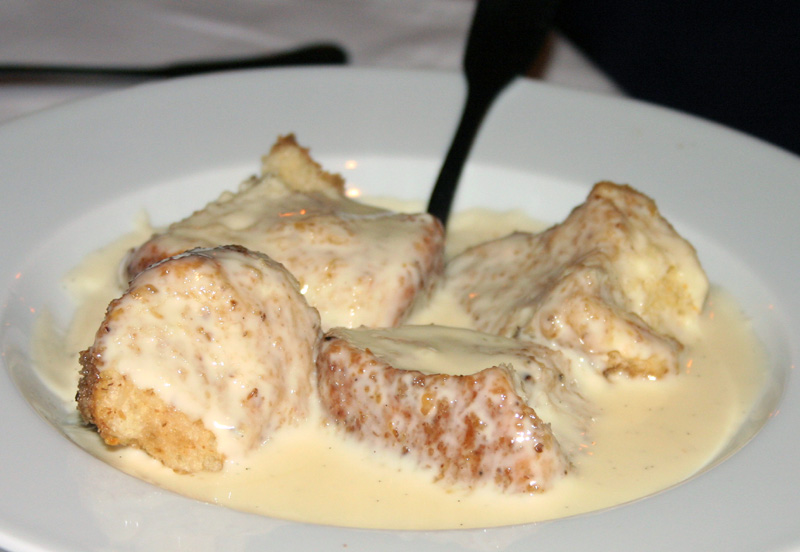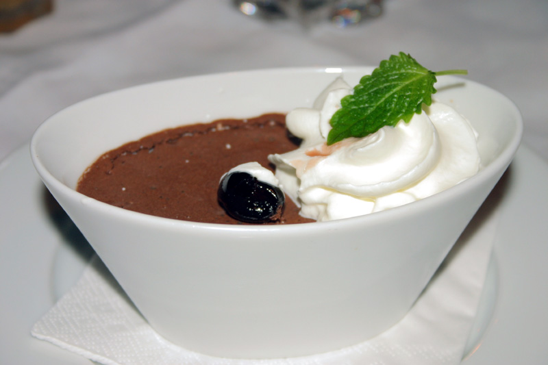 Az eddigiek után tán nem meglepő, a desszerteknél is keverednek a remek ízek a "kényelmi" megoldásokkal. Az aranygaluska (vaníliaszószba fojtva) (950 Ft) kiváló tésztáját vaníliaszemekkel ékesített poreredetű mártás húzza le, a csokimousse (870 Ft) fotóján pedig avatott szemek láthatják, állt már a hűtőben egy keveset, de legalább gondosan elkülönítve, vagyis nem vett fel idegen aromákat. Ízre-állagra rendben van, tetejére friss tejszínt nyomtak.