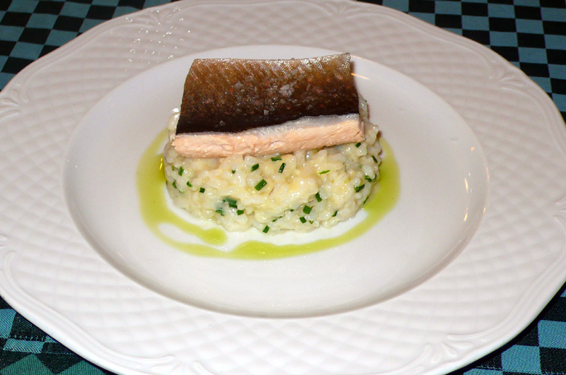 A Csalogányban még soha nem ettem rosszul elkészített húst, sőt, talán nem tökéletesen megsütöttet se, viszont gyakran találkozhatunk az ebédmenüben is prémium alapanyagokkal. A szajbling parmezános rizottóval egyszerűen hibátlan. A hal szaftos és gyönyörű, a rizottó szintén a legjobbak közé tartozik Budapesten. Sajna, nem tudom nem észrevenni, hogy az adag picike (jobb helyeken az ilyet elegánsnak mondanák), eszem is mellé egy szeletkét a ház remek kenyeréből. A friss morzsában sült borjúszűz cukkinifőzelékkel természetesen meglepetést okoz a szüleimnek, pontosabban a kiváló húshoz társuló modern "főzelék" műfaja számukra eddig ismeretlen volt. Azért megbarátkoznak vele, bár atyám keveselli az adagot.