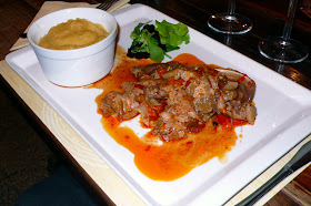 A tábláról választott csülökpörkölt újszerűen, sárgaborsó pürével és csípős paprikaolajjal (2300 Ft) finom, de tán túl újszerű, legalábbis nekem. Csülök alig van benne, inkább malacfül és farok, ezeket pedig a mostani divatokkal dacolva nem annyira kedvelem. A tálalás
