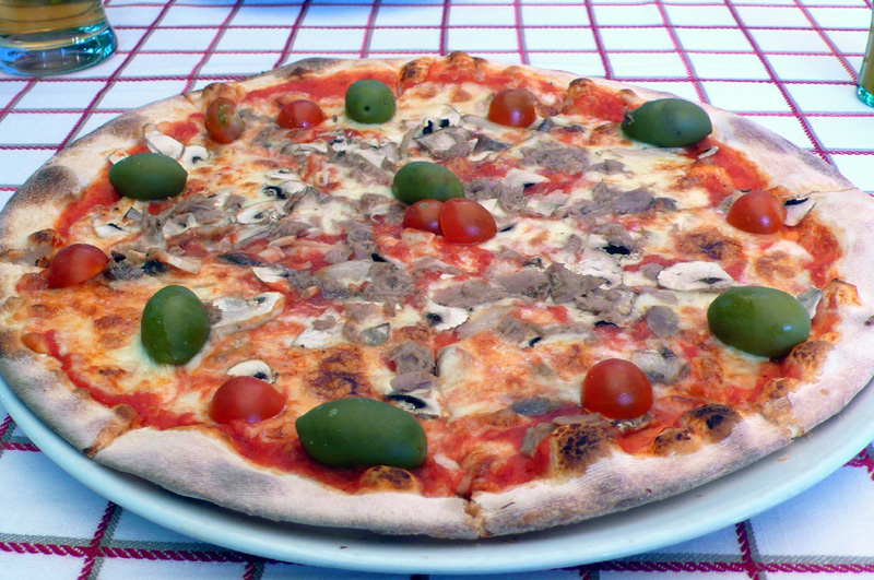 A Palermo pizza (gomba, friss paradicsom, tonhal, szardella, olajbogyó, 2390 Ft) kiváló, a tészta vékony, a feltétek minőségiek. Bizonyos jelekből úgy tűnik, nem a fatüzelésű kemencében sütötték, de ez nem sokat von le az élvezeti értékéből. Az a bizonyos "gourmet" tészta (pórés lazaccal töltött fekete cappellacci citromos vajmártással, 2290 Ft) nem valami hatalmas adag, viszont érdekes látvány és Kamilla szerint fantasztikusan finom - az egyik legjobb tészta, amivel az utóbbi években találkozott, pedig elég gyakran eszünk tésztát étteremben (és otthon is).
