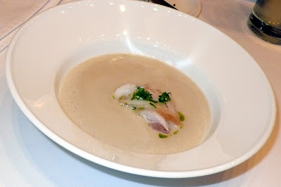 Friss és változatos pékáruk érkeznek kiváló vajjal, majd az első fogások. Ehran könnyít a pénztárcáján, feláras fogást választott (tonhal: pácolt, sült és tatár, yuzuval és ananásszal, + 2400 Ft). A tonhal 3 formában jelenik meg a tányéron, mindegyik tökéletes a maga nemében, a sült például csak hangyányit van megsütve. Az étel nagyon szép is a hosszúkás tányéron sorba rendezett, különféle tónusú vörös haldarabokkal és sárga zselékkel (sajna, a fotót elb*sztam). A leves (csicsókakrémleves marinált tőkehallal) se hagy maga után kívánnivalót, a koncentrált csicsókaíz és az édeskés-füstös hal összjátéka egész más dimenziókba repíti a krémlevest, mint a városban elterjedt "tejszínkrémlevesek". Nem tudom nem észrevenni, az adag aránylag normális, nem gyűszűnyi, ami nálam fontos szempont.