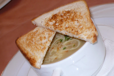 Atyám általában erőlevest eszik először májgombóccal (650 Ft), ami a csészényi mennyiség ellenére méretes és jó állagú házi májgombócot tartalmaz. A francia hagymaleves (650 Ft) a hazai, tejszínes változat, de nincs vele semmi baj. A levesekkel kapcsolatban fontos tudnivaló, hogy ha egész adag főételt tervezünk rendelni, jobb a levestől megtartóztatni magunkat.