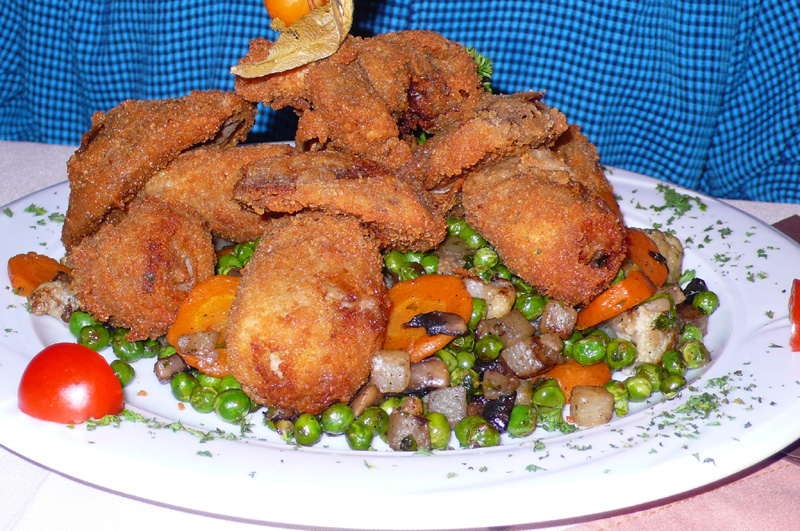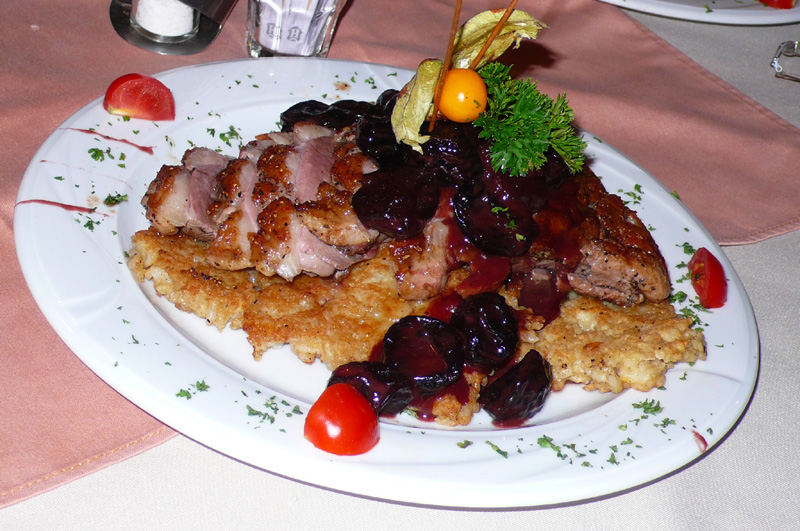 A bakonyi szűzérme galuskával (2490 Ft) az egyik olyan tétel, amit talán mindig evett valamelyikünk. Legutóbb 6 szelet szűzérme volt a tányéron... sajnos nem mindig hajlandóak féladagot felszolgálni. Kiváló fogás a rozé kacsamell rizsropogóson, aszaltszilva raguval (3190 Ft), a szilvaragu nem téved el a - kacsánál gyakran erőltetett - túlzott édesség irányába. Édesanyám elégedett volt az óvári sertésbordával (2990 Ft) és egy másik alkalommal a rántott vargányával (2690 Ft), bár a mennyiség mindkettőnél kifogott rajta.