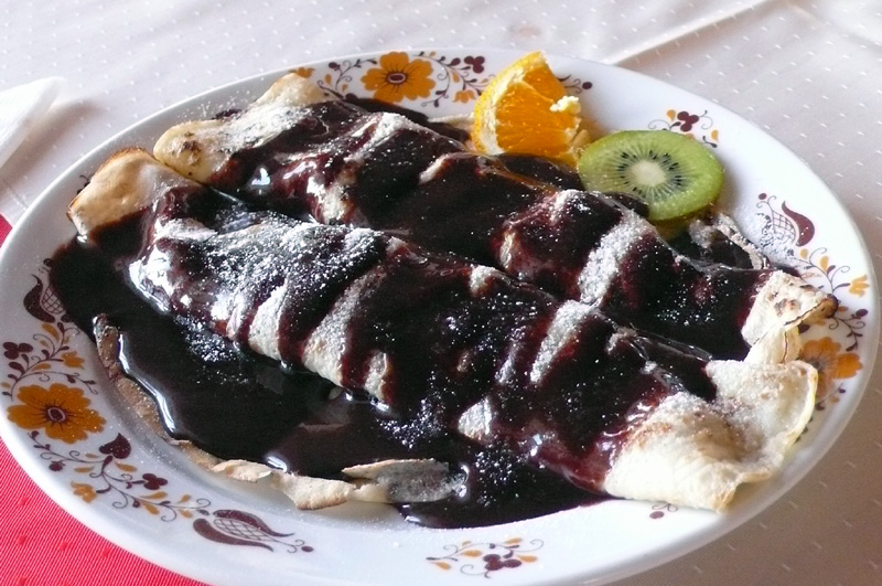 A desszertkínálat gerincét különböző palacsinták adják, a gesztenyést (700 Ft) kóstolom meg. A - gyakran unalmas - palacsinta lehetne éppen ínyenc desszert is. Pár apróság szükséges hozzá: frissen kell sütni, kiemelkedő minőségű töltelékkel ellátni, és ha öntetet-mártást adnak mellé, az élvezetes, minőségi legyen. Sajnos itt egyik feltétel se teljesül: a palacsinta legalább reggel óta áll, a gesztenyetöltelék valami olcsóbb, cukrozott termék, a csokiöntet kakaóból készült.