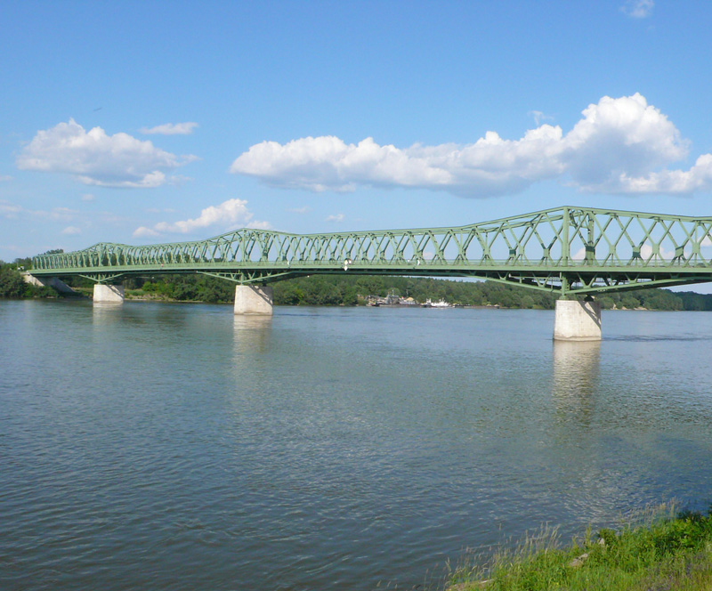 A dunaföldvári Halászcsárdában még nem pakolták ki az asztalokat a kertbe (vagy beszedték őket a korábbi zápor miatt), de az asztalomtól így is ráláttam a hídra.