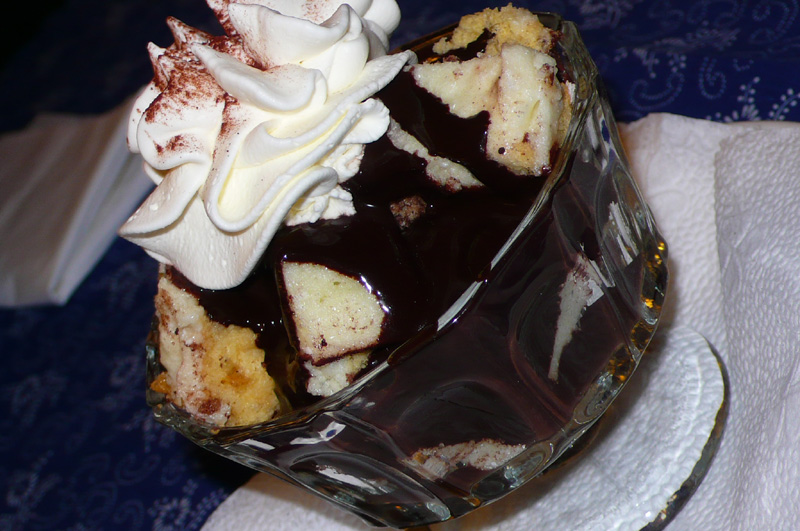 Bár jóllaktam, szokás szerint nem tudom megállni, hogy ne egyek desszertet. Somlóiból bőségesen elégnek bizonyul a kisebbik kiszerelés (kehely: 600 Ft). Az állagot és a fő alkotórészeket nem érheti kritika, a Tanyacsárda somlóijának élvezeti értéke meghaladja a magyar átlagot. A hab kenőcsös jellegű, valószínűleg tartalmaz növényi komponenst, bár ennek ellenkezőjéről hosszasan igyekezett meggyőzni a cég egyik dolgozója a Hejszakácsok portál Garaczi János csárdagazdáról szóló cikke alatt. Sajnos, makeEEEr utóbb a bizonyíték (a Metróból érkező sárga vödör) csekkolása helyett beszüntette a hozzászólást...