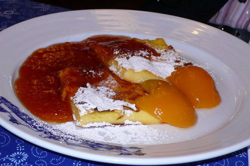 Kamilla tejespitéje barackízzel és barackbefőttel (590 Ft) - az obligát cukorszórást leszámítva - teljesen rendben van.