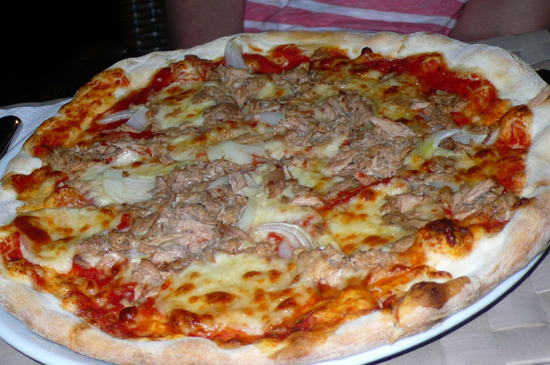 Szép számmal ültek a kellemes kertben, de azért akadt szabad asztal. A kellemesen hűsítő sárgadinnye-krémlevest (790 Ft) követő tonhalas-hagymás pizza (1700 Ft) elfogyasztása után örömmel könyveltünk el egy újabb látogatásra érdemes pizzalelőhelyet. Talán csak a tonhal túlzott adagolását lehetne felróni, de azt meg minek, legalább nem sajnálták tőlünk.
