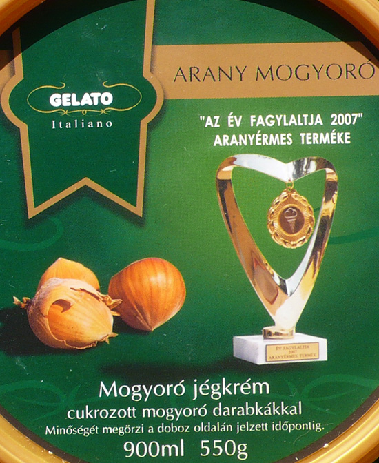 A doboz felirata szerint ez egy mogyorójégkrém cukrozott mogyoródarabkákkal, "Az év fagylaltja 2007" aranyérmes terméke.