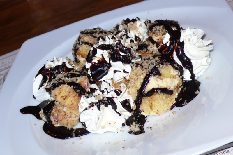 A sztékes helyeken a desszertre ritkán jut figyelem, lásd például a kiskörúti Pampas. Nem reméltem sokat a somlóitól (690 Ft), de a várakozásomat sikerült bőven alulmúlni, ez a példány befért életem 3 legrosszabbja közé (további dobogósok: Szent Jupát és Krapaj Csárda). Úgy tűnik, a konyhai stáb igyekszik a somlóit sütés-főzés nélkül megúszni. Ezzel nem is lenne semmi baj, ha a különféle ipari alapanyagokból összeállított desszertek finomabbak lennének, mint az ódivatú műveletekkel készítettek, de sajnos, nem így van. Tán ennyit se érdemes vesződni, van számos termelő, aki kb. 300 bruttó magyar forintért szállít ilyen somlóit, azt az energiatakarékosság jegyében az átlátszó műanyag tálkácskájában is fel lehetne szolgálni a mélyen tisztelt vendégnek. A felét meghagytam és a növényihab-halmocskákból kiraktam egy sormintát a tányér szélén, remélve, hogy felkeltem a pincér érdeklődését, de nem kérdezte meg, mi volt a baj a desszerttel.