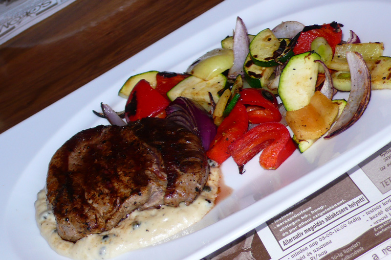 A grillezett zöldségekkel kísért mini steak (2790 Ft) húsmennyisége (18 dkg) nekem bőven elég. Számos helyen sütnek már ennél jobb húsból jobb sztéket, de igazán nem volt ok a panaszra. A zöldborsmártás-paródiát - hát, hogy is mondjam - még lehetne fejleszteni.