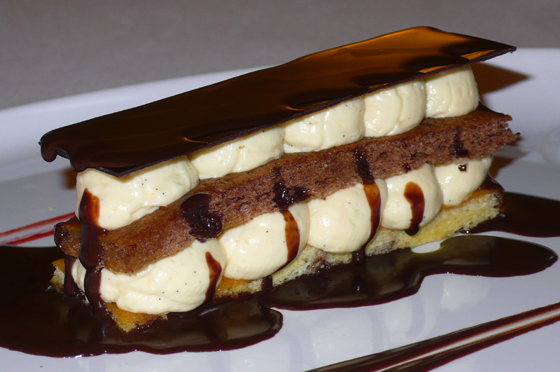 Egy desszertre azért rászánom magam, a szombati teniszversenyig még van két nap diétázni. Otthon a lúdlábat néztem ki, de ezt nem látom az étlapon. A madártej és a somlói (1250 Ft) között vacillálok. Az utóbbit épített konstrukciónak nevezi a pincér, és valóban, szép, réteges cucc érkezik, remek csokiöntet kíséretében. Az ilyen megvariált ételeknél mindig aktuális a kérdés, meddig lehet az eredeti néven nevezni, ez itt kb. határeset, viszont az étlap nem árul zsákbamacskát, a somlói megnevezés macskakörmök között (vagy 67-verzióként) szerepel. Két puha piskóta, krém valódi vaníliával, ropogós csokitető, minőségi, nem túl édes öntet - mit kívánhat még az ember? Esetleg egy kis mazsolát, mondjuk zselé formájában. Tán meg is valósítja egyszer az új séf és a kritikákra szenzibilisen reagáló tulajdonos.