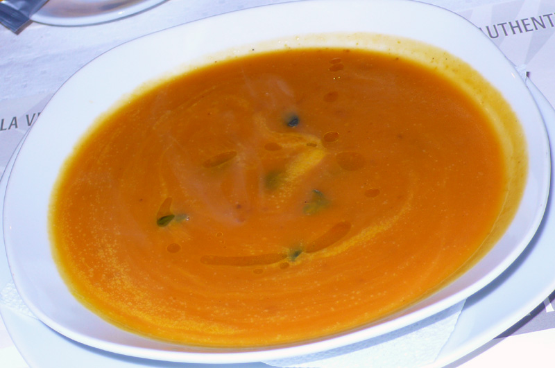 A melengetőnek rendelt sütőtökkrémleves (crema di zucca, 890 Ft) nem vidított fel túlzottan. Toszkán paradicsomlevesekhez hasonló, mártásszerű állaga ellenére nem volt intenzív íze - leszámítva az intenzív sósságot.