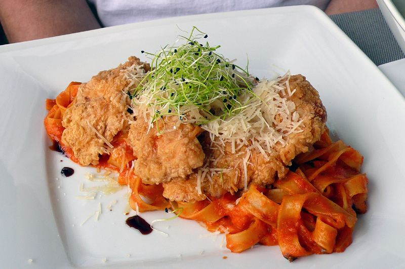 A hosszú nevű, szaloncukorra hajazó házi tésztából (caramelline con mascarpone, San Daniele e zucchine, al pomodoro e timo, 2400 Ft) kiadós, majd' főételnyi porció érkezett; sajnos a "cukrok" egy része főzés közben elhagyta kellemes, cukkinidarabokat is tartalmazó töltelékét. A paradicsomszósz nem hozta a várt kakukkfűízt, csak mellétették az ágacskákat.