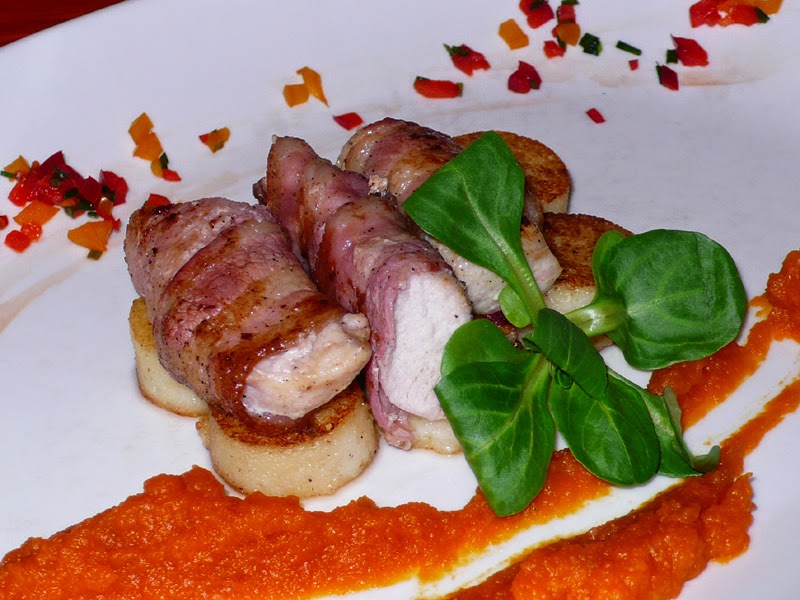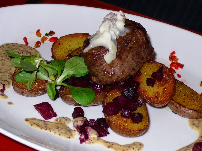 Főételnek a mérsékelt árkategóriából választottam (baconos nyúlgerinc gyömbéres sütőtökpürével, vajban pirított római gnocchival, 2950 Ft), míg Masashi (érlelt szürkemarha bélszín bükki faszenes camamberttel sütve dijonimustár-mártással, glasszírozott céklával, rozmaringos parázsburgonyával, 4980 Ft) és Takeo (grillezett libamájszeletek mandulás burgonyafánkkal, kakukkfüves mustmártással, 4980 Ft) rámentek a leghúzósabb árfekvésű tételekre és nem bánták meg a választásukat. A drága ételek érdekes módon laktatóbbnak is bizonyultak, míg az én fogásom a 3 db miniatűr nyuszihusival és az alatta megbújó 6 szem gnocchival sajnos felidézte a Hold-béli bonsai kacsamellet. Eddig a Mandragórában nem volt divat a mütyür adag - és hál'isten a 30 deka hús + fél kiló köret kombináció se -, remélem, ez a jövőben is így marad...