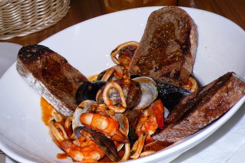 A leveskínálat tartalmaz egyedi darabot is: a zöldborsókrémleves tintahallal (1600 Ft) érdekes párosítás, a tintahal lágy, puha, kontrasztként friss paradicsomkockák s némi roppanós hagyma szolgálnak. A kissé megtévesztő nevű vegyes tengeri ízelítő (antipasto caldo di mare, 2000 Ft) is egyfajta kiadós-csípős tengeri herkentyűs leves, tintahallal, óriásgarnélával, kétféle kagylóval, kissé trehányul megpirított (illetve meg nem kapirgált), de finom olívás pirítóssal.
