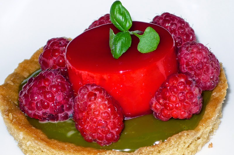Elsőnek kértem egy pisztáciatortát málnával, majd miután ez (omlós tésztakosárkában viszkózus, intenzíven pisztáciás krém, málna három formában: gyümölcs, mousse, zselé) beváltotta a hozzá fűzött reményeimet, kis spéttel követte őt egy sajttorta házi baracklekvárral. A sajttorta talpa diós, a torta langyos, a krémje könnyű; a mellé adott, igen hideg és borzongatóan savanyú lekvárt viszont - khmmm - nehezemre esett kontrasztként elfogadni.