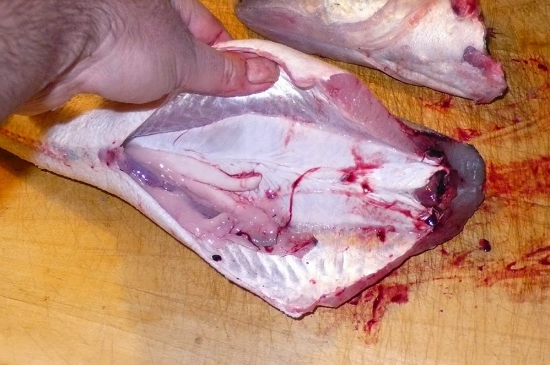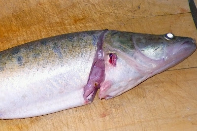 Némi rutinnal - ha ismerjük az epehólyag elhelyezkedését - a has felnyitása előtt is levághatjuk a fejet (ollóval vágjuk át a gerincet!), de lehet úgy is csinálni, hogy a fej eltávolítása előtt a kopoltyúk tövétől a végbélnyílásig hatoló vágással kibelezzük a halunkat.