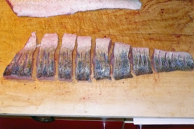 Filézni többféleképp lehet, én az itt látható - hústakarékos - módszert kedvelem. Tehát a hasüreget védő nagy szálkákat (bordákat) nem távolítom el, ezeket sütés után könnyen ki lehet húzni, míg pucoláskor az eltávolításuk csak aránylag jelentős húsmennyiség elvesztésével oldható meg, a hát felől indítva. A bordák tövének átvágásához megint ollót érdemes használni, majd a fejtől a farok felé haladva késünkkel mindkét felet lefejtjük a gerincről.