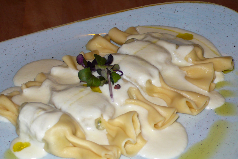 A spenótos-rikottás caramelle (2290 Ft) remek, a szaloncukorkák állaga ruganyos, az arányok jók. A mellé adott parmezánszósz nem teng túl, de nem is kevés.