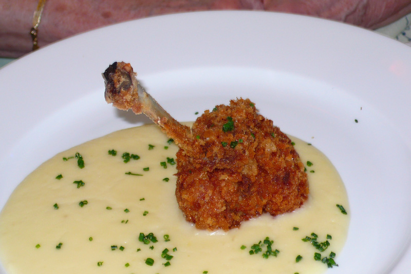 Tetszik, hogy van többféle, kissé turbózott főzelék, most éppen zöldborsófőzelék (2200 Ft). Nem olyan (rántásos), mint a mamámé, inkább egy kifejező ízű borsómártás, benne nem teljesen átfőtt borsószemekkel, borsóhajtással, aszalt paradicsommal és grillezett camambert sajttal. A krémlevesek (spárga, karalábé) a legjobb helyeket idézően selymesek és intenzívek. Kevésbé voltunk meghatódva a rántott csirkecombtól (2600 Ft), ami ugyan szépen van elkészítve, a mellé adott kecskesajtos krumplipürében se spóroltak a kecskesajttal, viszont egy darab apró alsócomb egy adagnak... hát hogy is mondjam, nem nagyvonalú. Ki lehetne egészíteni más rántott alkatrésszel (pl. máj), és esetleg kissé feljebb nyomni az árát, mindjárt nem maradna utána hiányérzet.