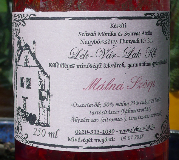 Összetétel: 50% málna, 25% cukor, 25% víz, tartósítószer (káliumszorbát), étkezési sav (citromsav), természetes színezék